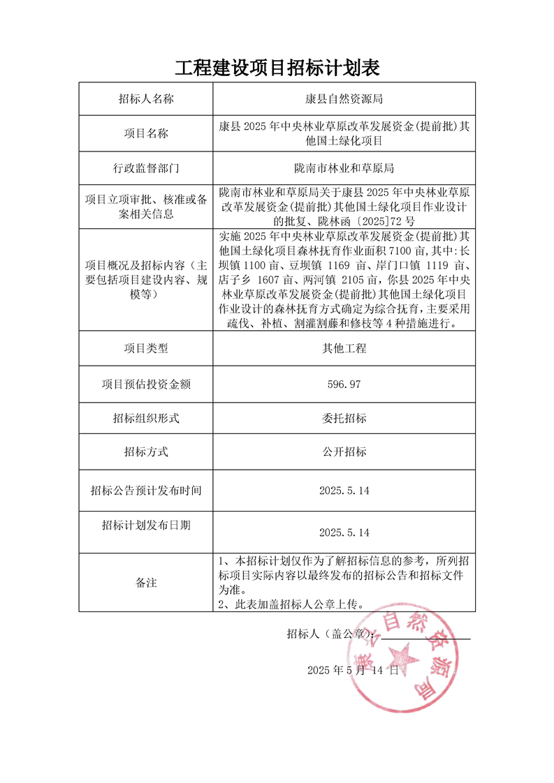 康縣2025年中央林業草原改革發展資金(提前批)其他國土綠化項目
