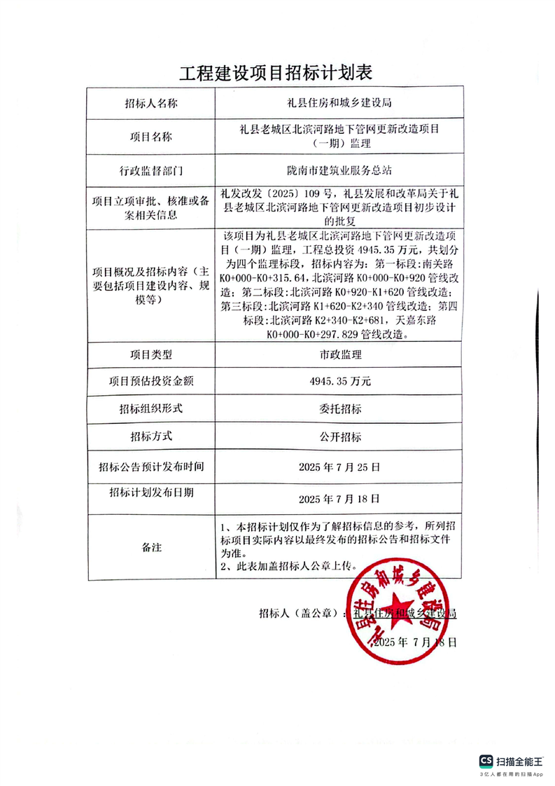 禮縣老城區北濱河路地下管網更新改造項目(一期)監理