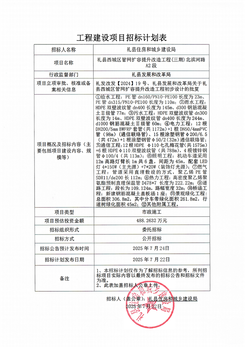 禮縣西城區管網擴容提升改造工程(三期)北濱河路A2段