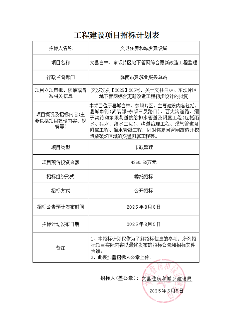 文縣白林、東壩片區地下管網綜合更新改造工程監理