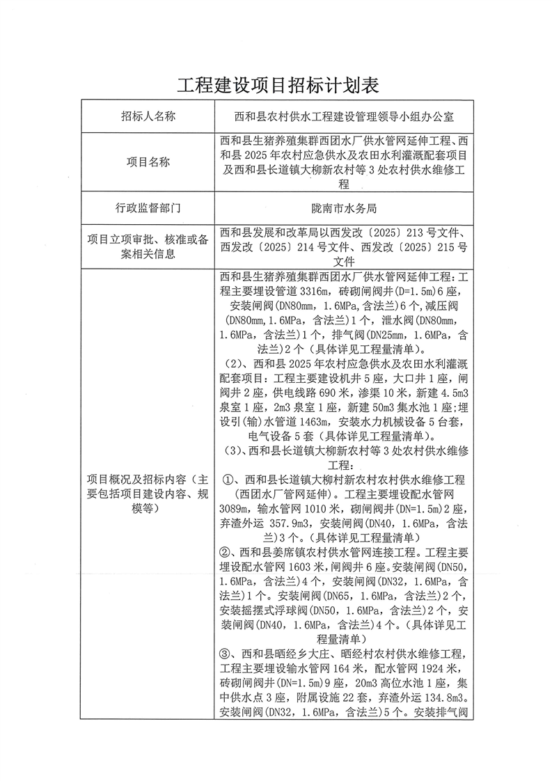 西和縣生豬養殖集群西團水廠供水管網延伸工程、 西和縣2025年農村應急供水及農田水利灌溉配套項目及西和縣長道鎮大柳新農村等3處農村供水維修工程