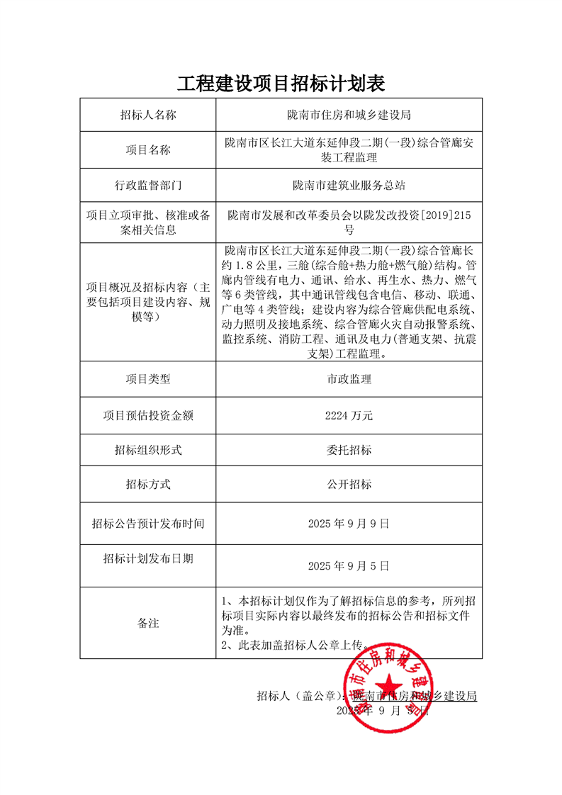 隴南市區長江大道東延伸段二期(一段)綜合管廊安裝工程監理