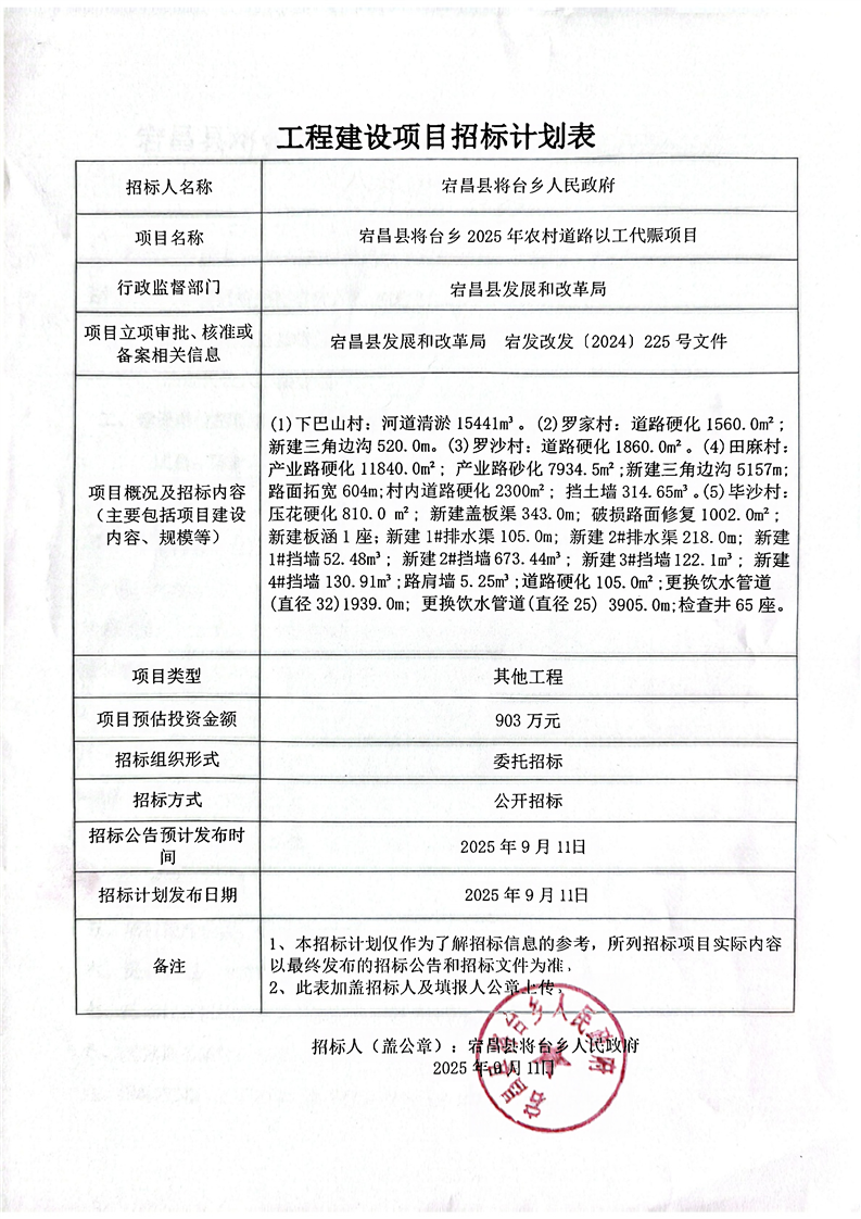宕昌縣將臺鄉2025年農村道路以工代賑項目