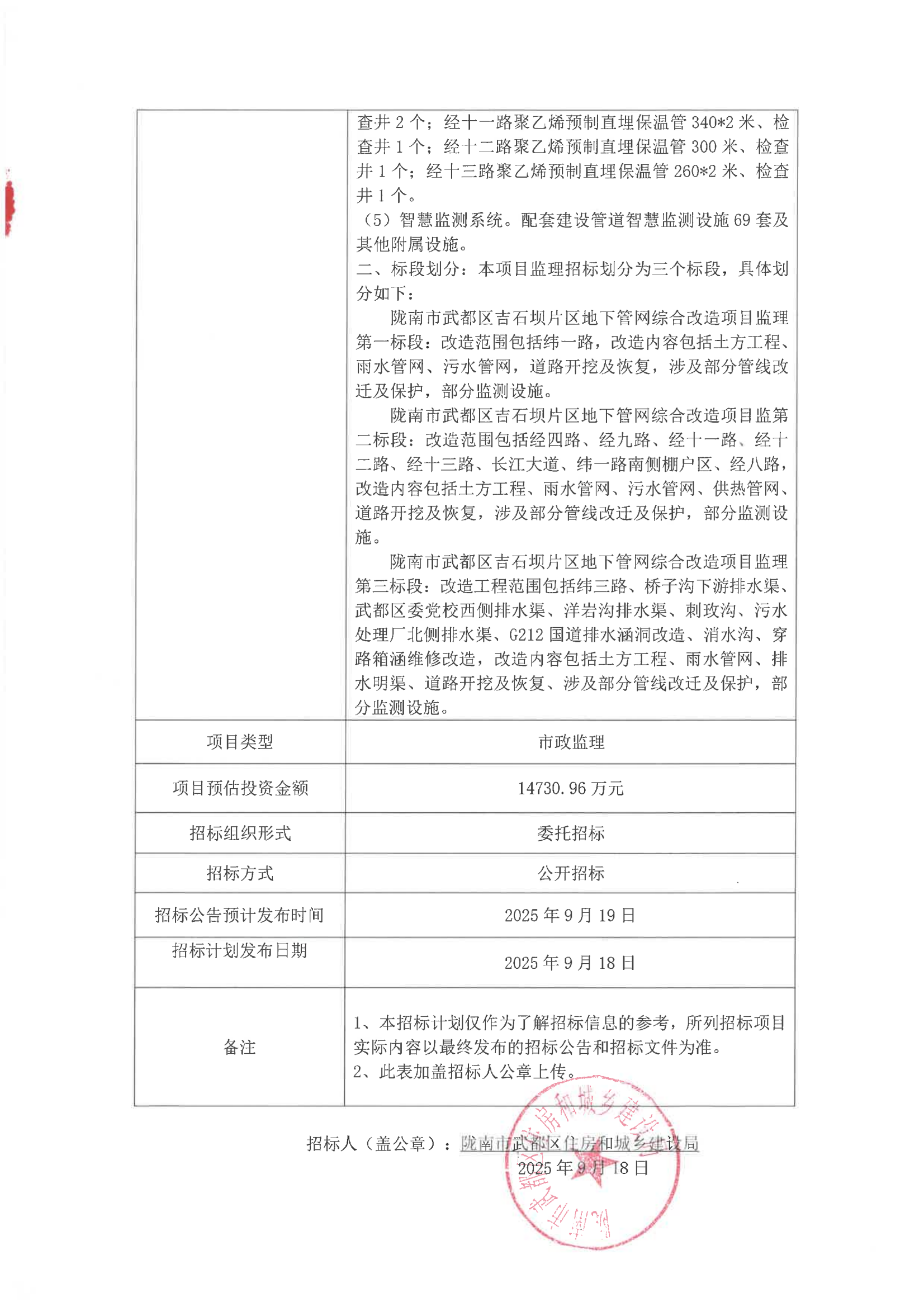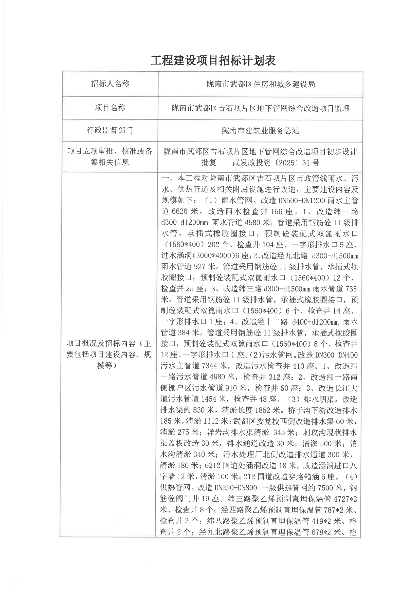 隴南市武都區吉石壩片區地下管網綜合改造項目監理