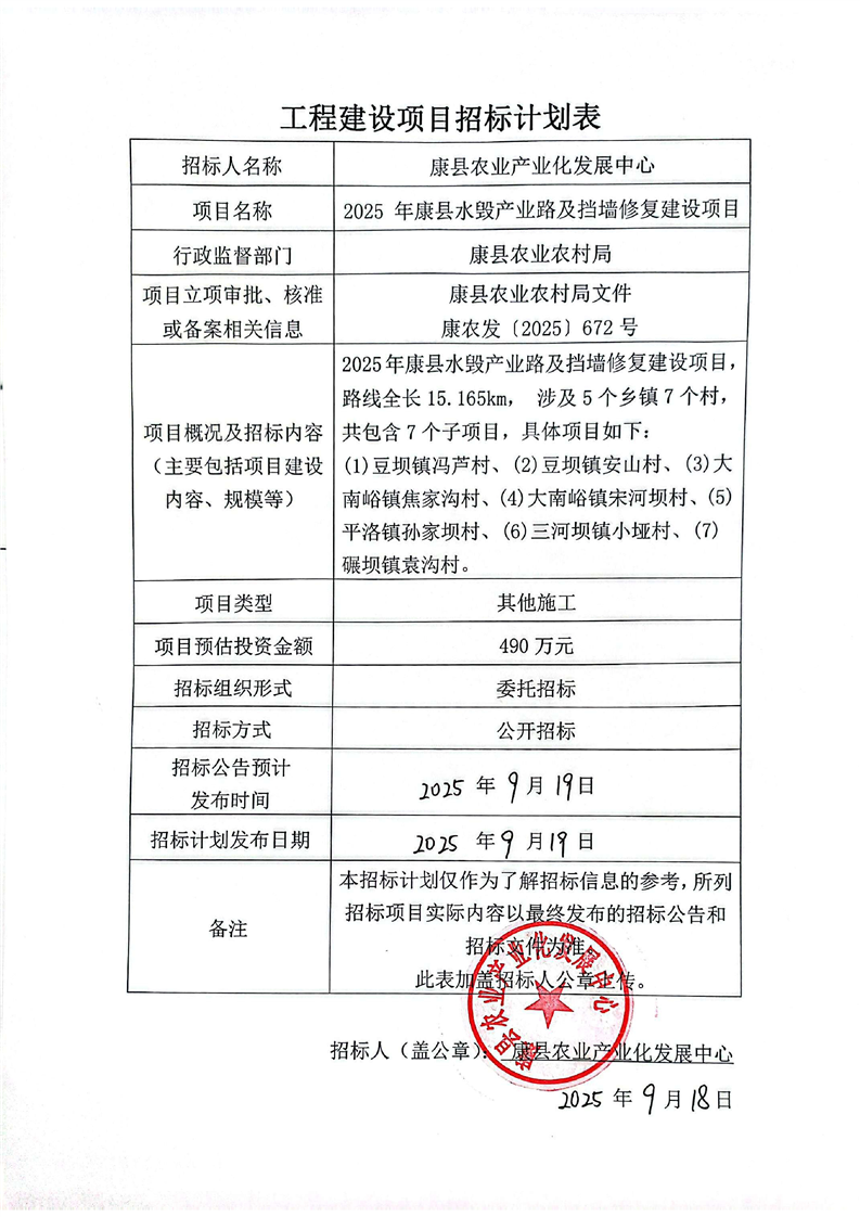 2025 年康縣水毀產業路及擋墻修復建設項目