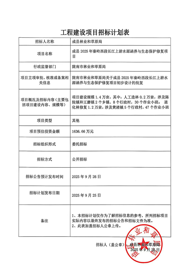 成縣2025年秦嶺西段長江上游水源涵養與生態保護修復項目