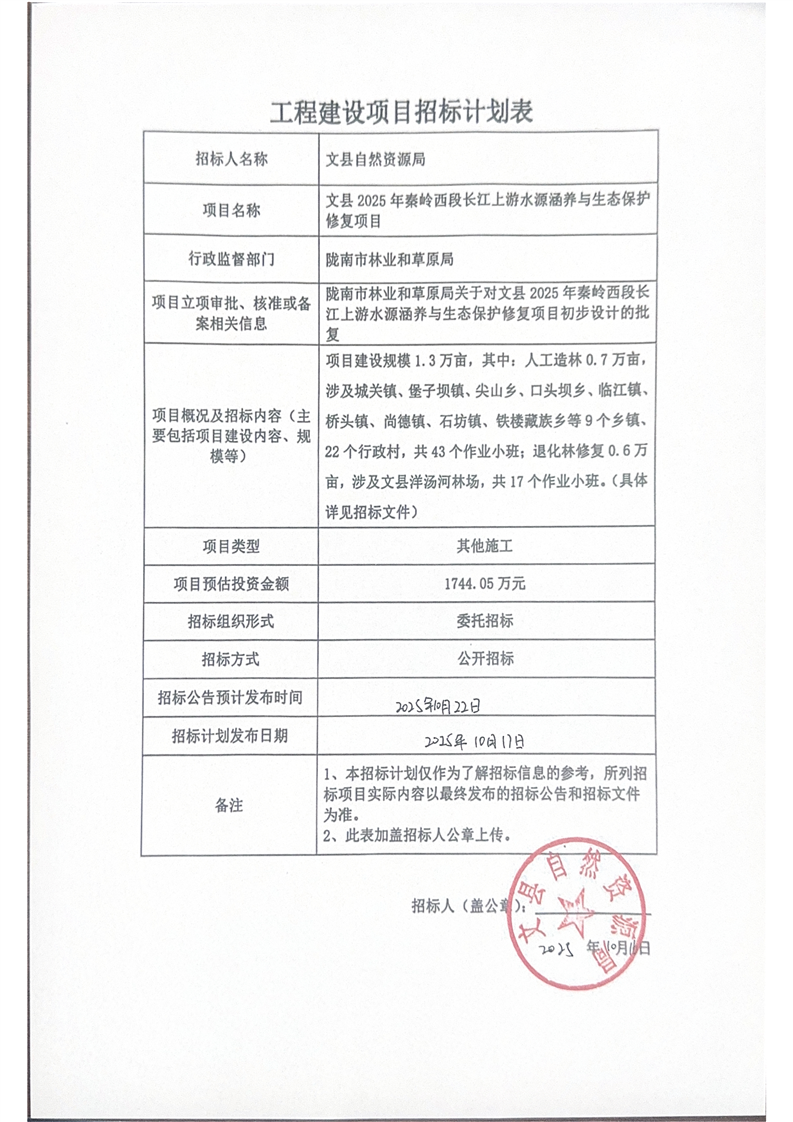 文縣2025年秦嶺西段長江上游水源涵養與生態保護修復項目