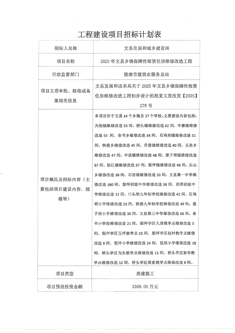 2025年文縣鄉鎮保障性租賃住房維修改造工程