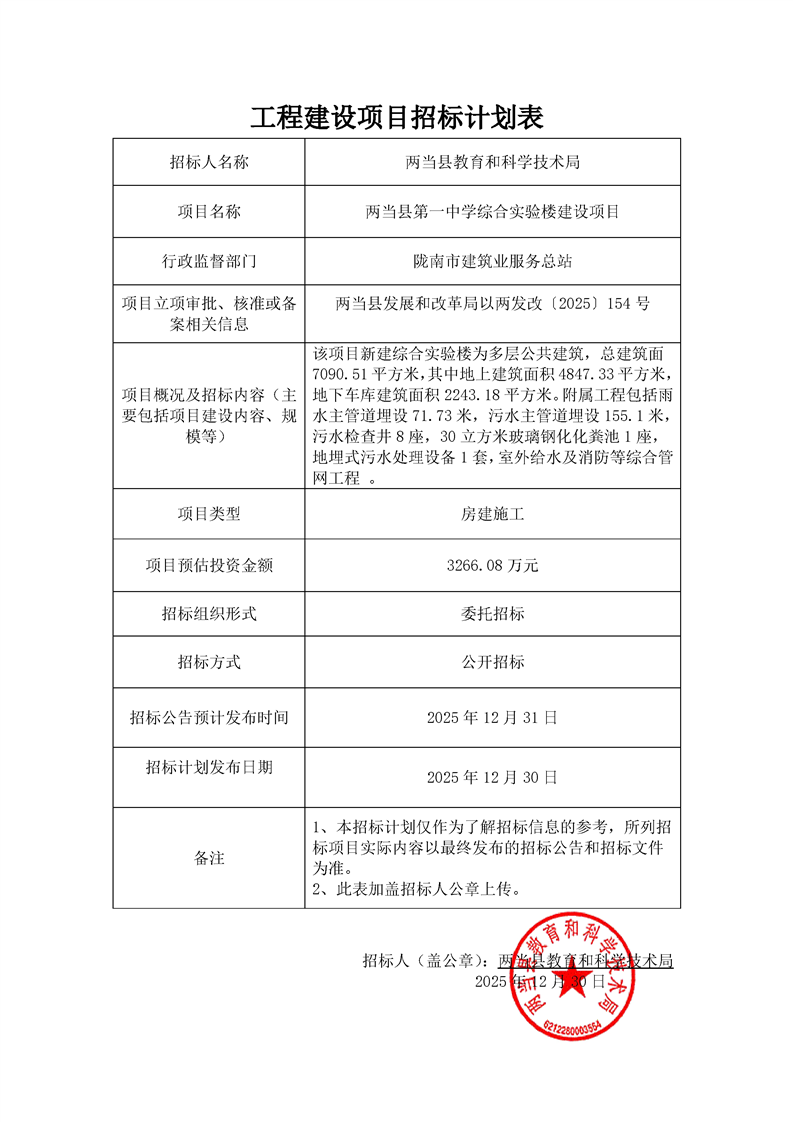 兩當縣第一中學綜合實驗樓建設項目