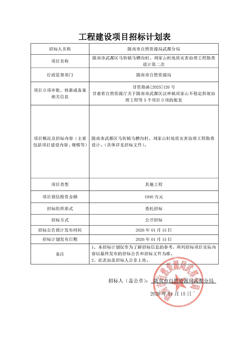隴南市武都區馬街鎮馬槽溝村、劉家山村地質災害治理工程項目勘查設計第二次