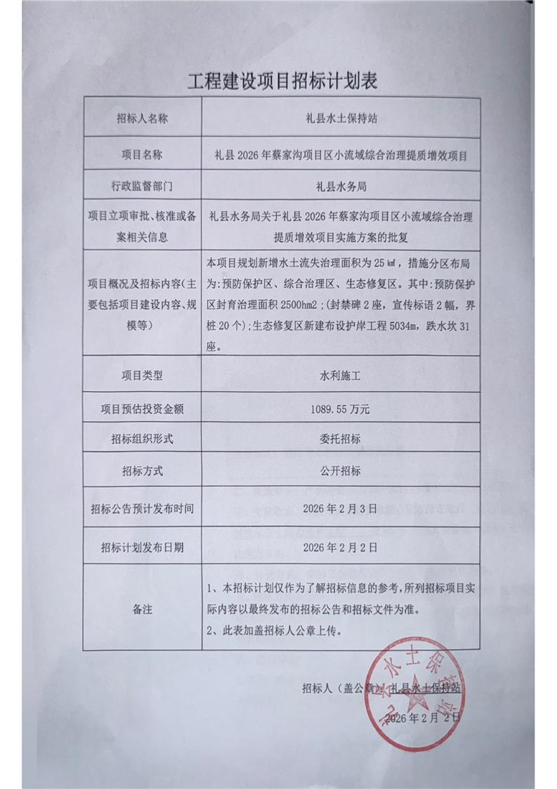 禮縣2026年蔡家溝項目區小流域綜合治理提質增效項目