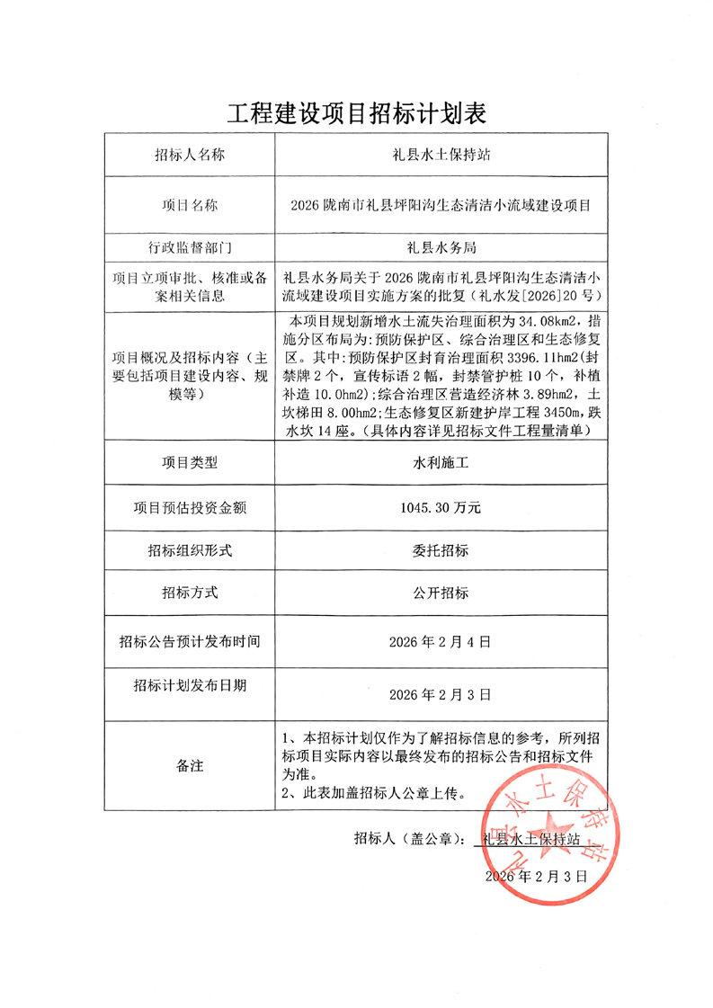 2026隴南市禮縣坪陽溝生態清潔小流域建設項目