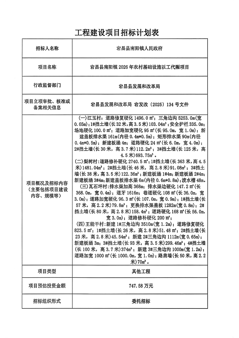 宕昌縣南陽鎮2026年農村基礎設施以工代賑項目