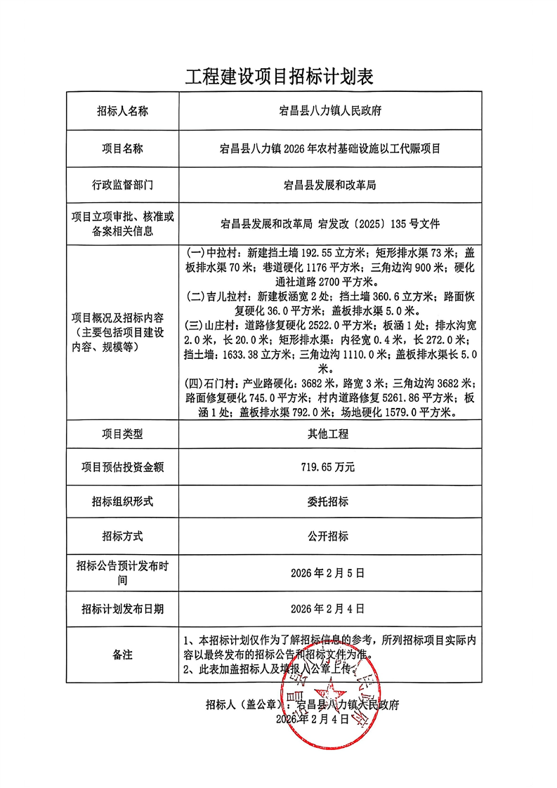 宕昌縣八力鎮2026年農村基礎設施以工代賑項目