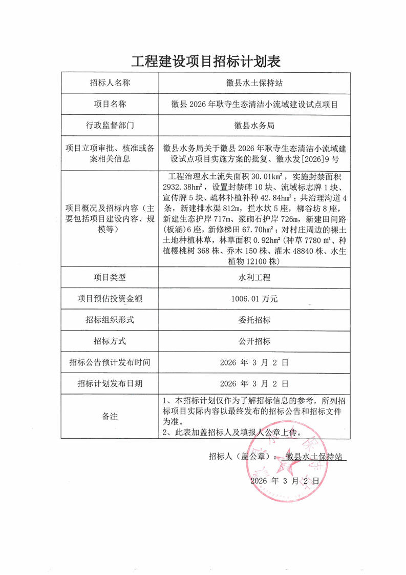 徽縣2026年耿寺生態清潔小流域建設試點項目