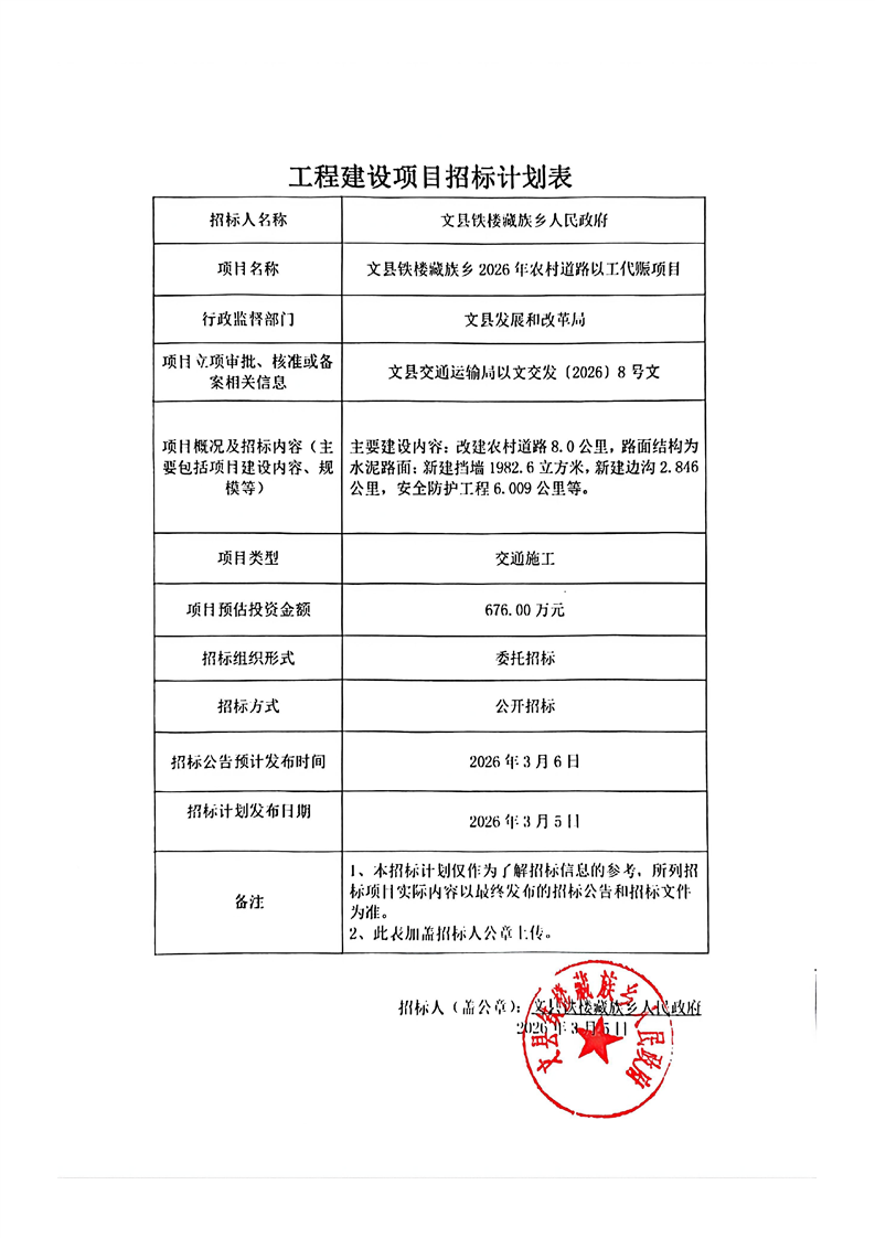 文縣鐵樓藏族鄉2026年農村道路以工代賑項目