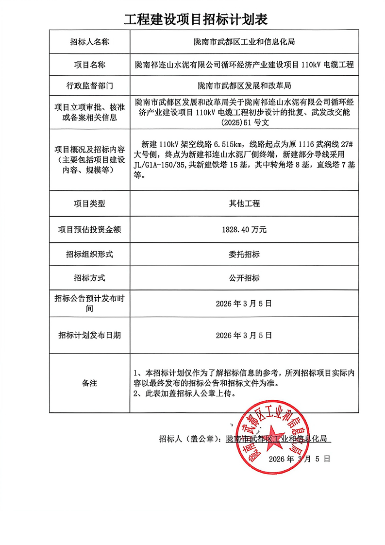 隴南祁連山水泥有限公司循環經濟產業建設項目110kV電纜工程