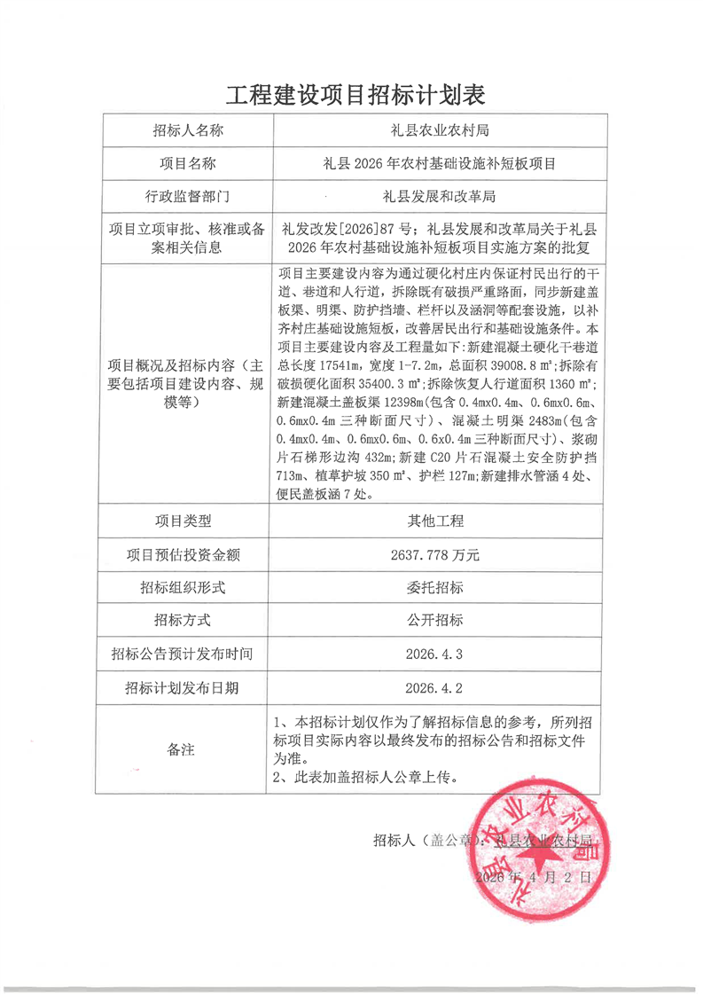禮縣2026年農(nóng)村基礎設施補短板項目