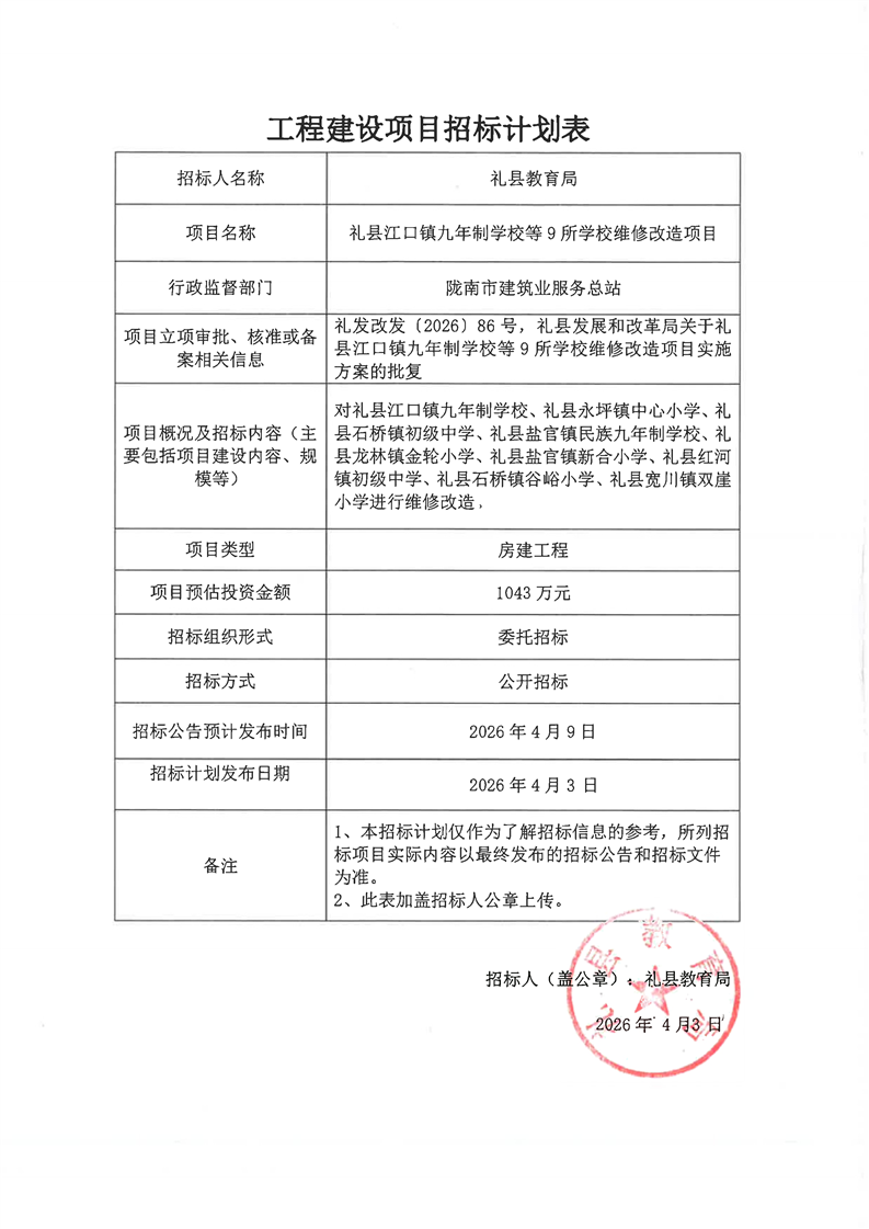 禮縣江口鎮九年制學校等9所學校維修改造項目