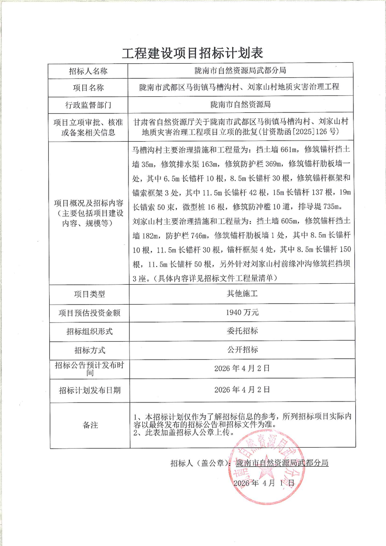 隴南市武都區馬街鎮馬槽溝村、劉家山村地質災害治理工程