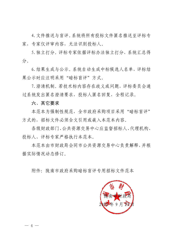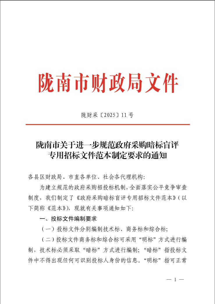 隴南市關于進一步規范政府采購暗標盲評專用招標文件范本制定要求的通知